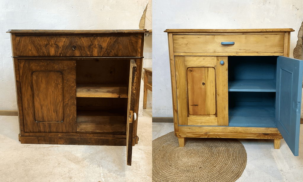 …he eliminado completamente la vieja chapa exterior y la madera de pino se ha decapado y lijado